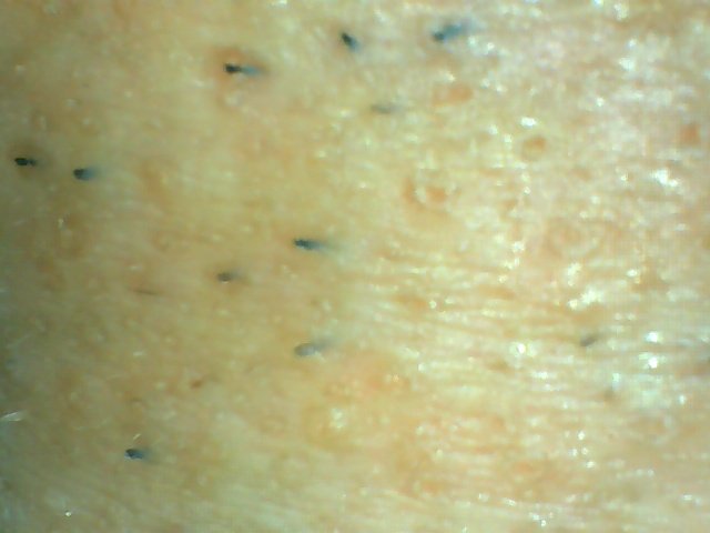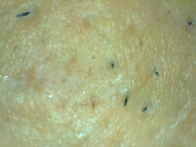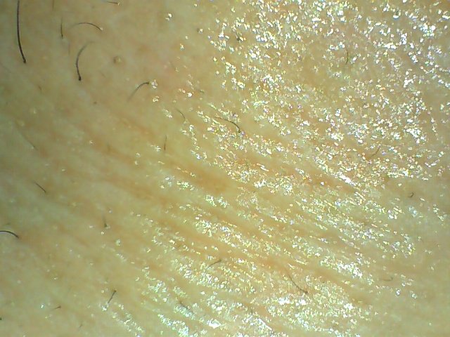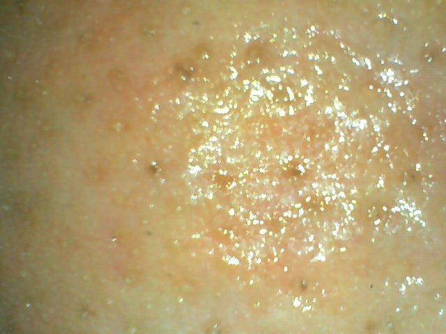 - **ลักษณะที่เห็น:** ผิวหน้าผากมีความมันและมีริ้วรอยบาง ๆ บางจุดอาจมีรูขุมขนกว้างหรือสิวหนองเล็กน้อย