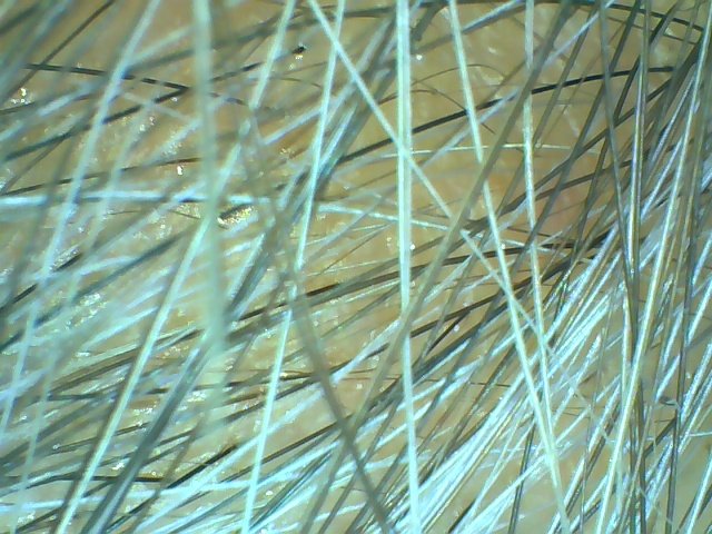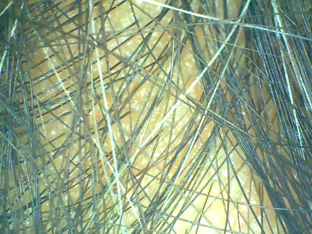 - **ลักษณะที่เห็น**: ผิวหนังตรงกลางศีรษะเรียบ แต่มีกลุ่มผมบางพื้นที่ที่อาจจะดูแห้งหรือเส้นผมไม่มีชีวิตชีวา